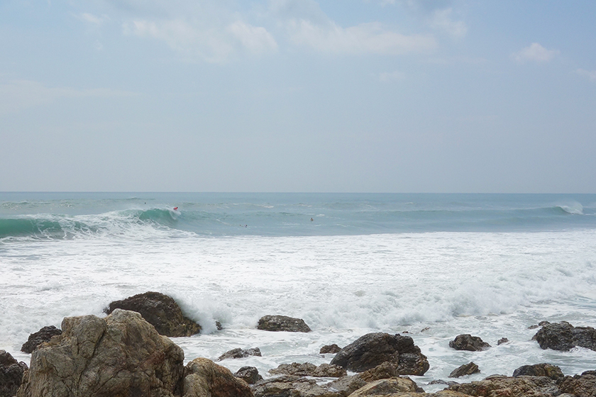 フードコートにつづき二度目の驚きは、波の大きさ。選手がテイクオフしている波はミドルなので沖のセットは軽くダブルオーバーはある。